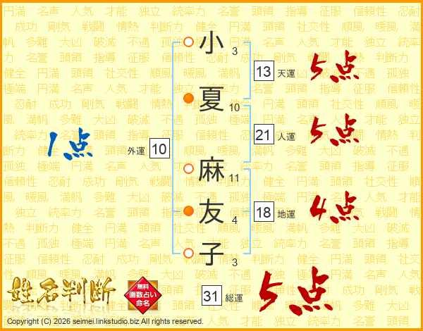 小夏麻友子さんの総運は31画の5点!