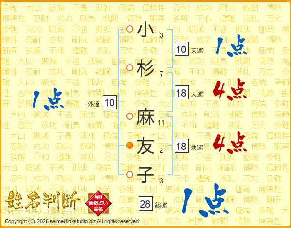 小杉麻友子さんの総運は28画の1点!