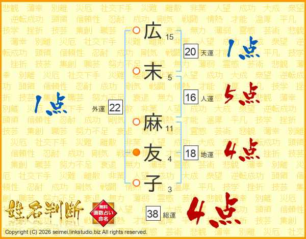 広(15画)末(5画) 麻(11画)友(4画)子(3画)