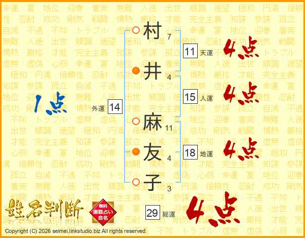 村(7画)井(4画) 麻(11画)友(4画)子(3画)