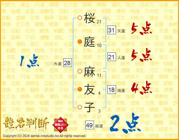 桜(21画)庭(10画) 麻(11画)友(4画)子(3画)