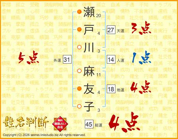 瀬戸川麻友子さんの総運は45画の4点!