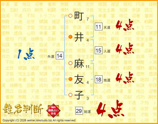 町(7画)井(4画) 麻(11画)友(4画)子(3画)