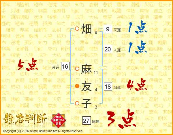 畑(9画) 麻(11画)友(4画)子(3画)