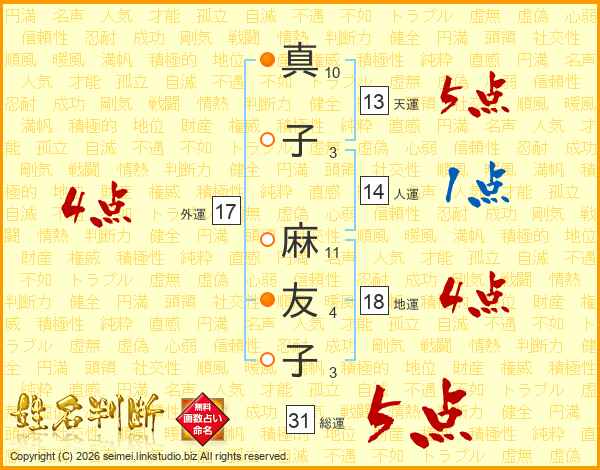 真(10画)子(3画) 麻(11画)友(4画)子(3画)