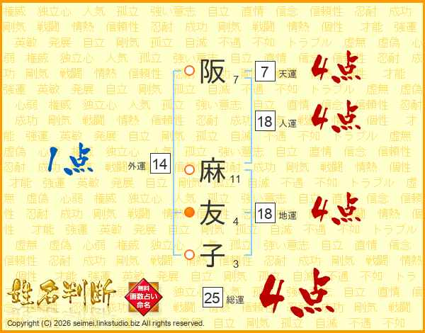 阪(7画) 麻(11画)友(4画)子(3画)