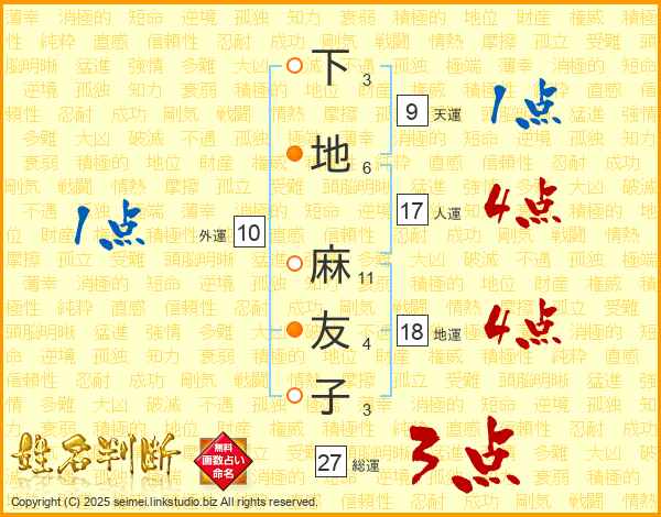 下(3画)地(6画) 麻(11画)友(4画)子(3画)