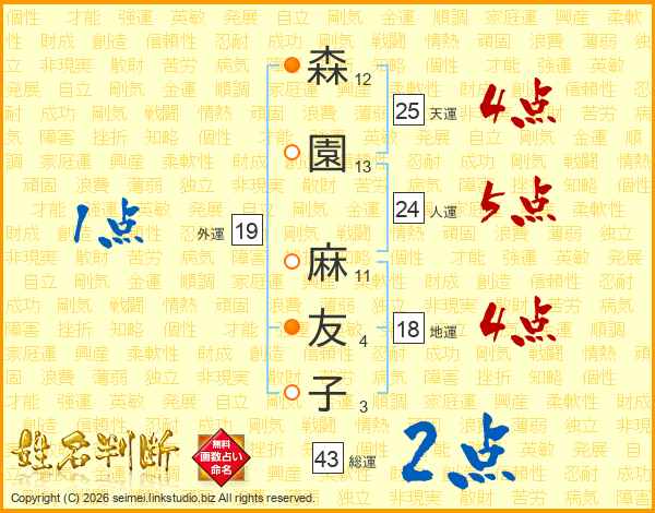 森(12画)園(13画) 麻(11画)友(4画)子(3画)