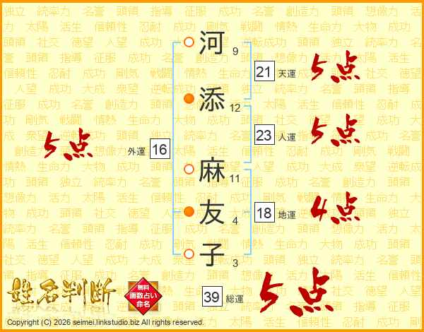 河(9画)添(12画) 麻(11画)友(4画)子(3画)