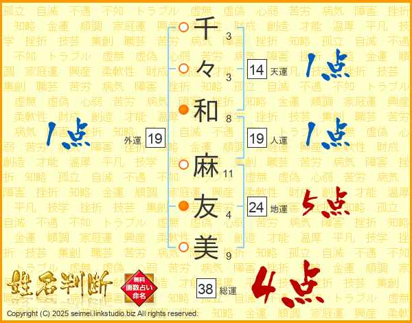 千(3画)々(3画)和(8画) 麻(11画)友(4画)美(9画)