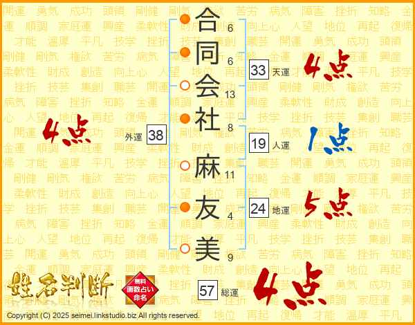 合同会社麻友美さんの外運は38画の4点!