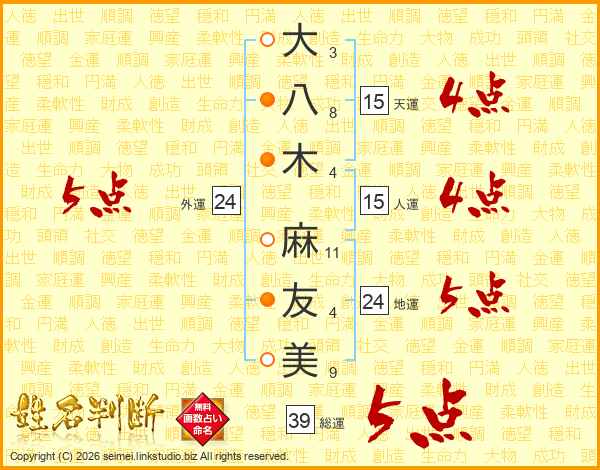 大(3画)八(8画)木(4画) 麻(11画)友(4画)美(9画)