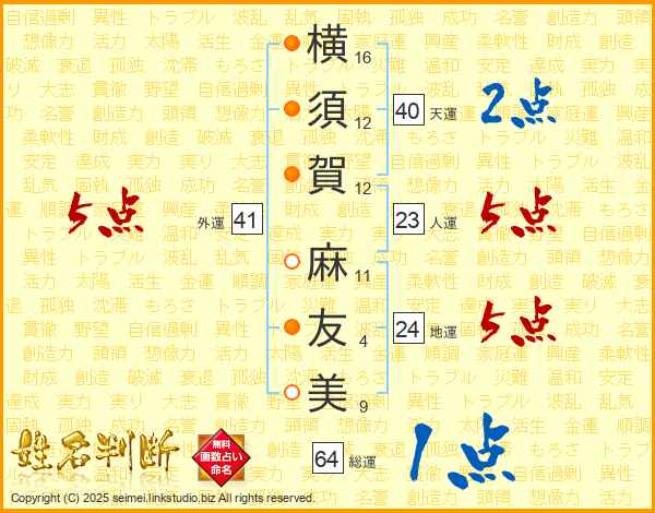横(16画)須(12画)賀(12画) 麻(11画)友(4画)美(9画)