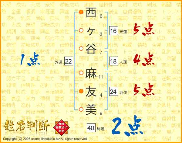 西(6画)ヶ(3画)谷(7画) 麻(11画)友(4画)美(9画)