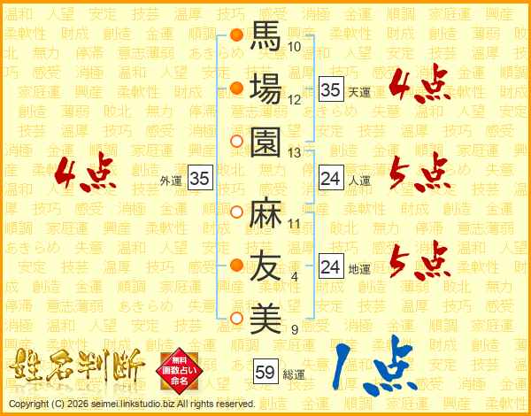 馬(10画)場(12画)園(13画) 麻(11画)友(4画)美(9画)