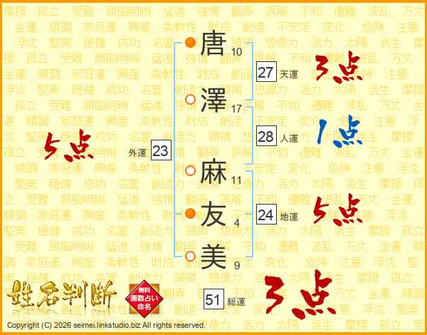 唐(10画)澤(17画) 麻(11画)友(4画)美(9画)