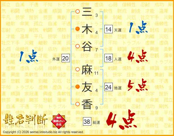 三木谷麻友香さんの総運は38画の4点!
