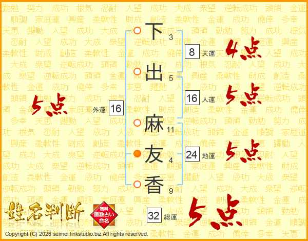 下出麻友香さんの総運は32画の5点!