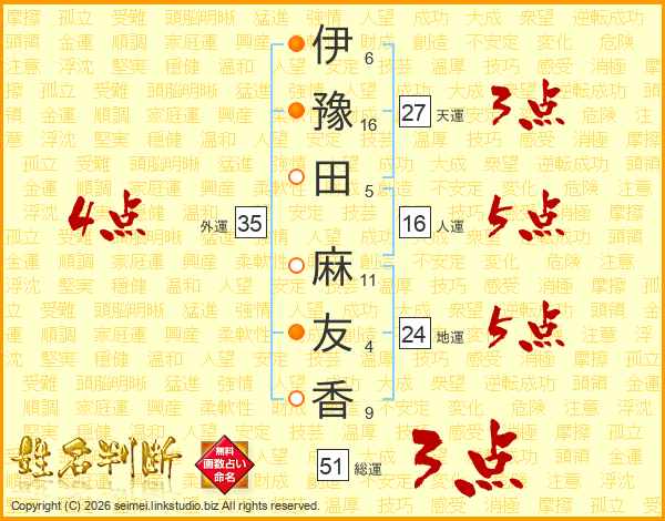 伊(6画)豫(16画)田(5画) 麻(11画)友(4画)香(9画)