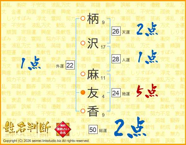 柄(9画)沢(17画) 麻(11画)友(4画)香(9画)
