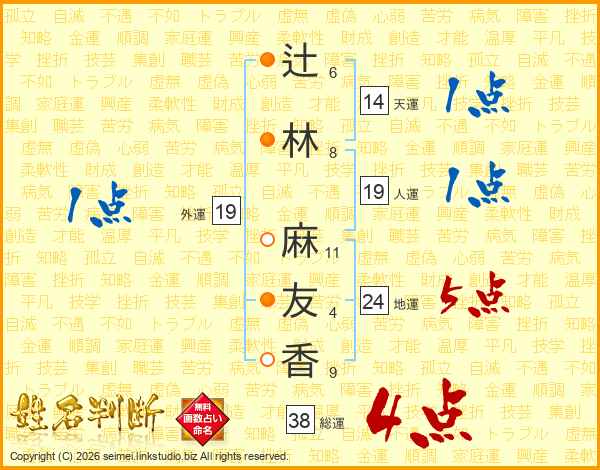 辻(6画)林(8画) 麻(11画)友(4画)香(9画)