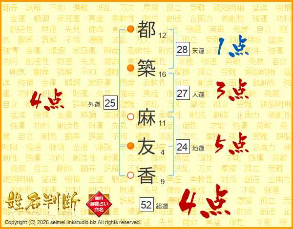 都(12画)築(16画) 麻(11画)友(4画)香(9画)