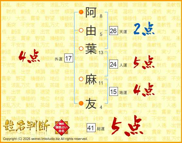 阿由葉麻友さんの総運は41画の5点!