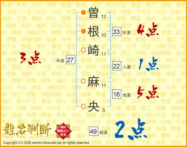 曽(12画)根(10画)崎(11画) 麻(11画)央(5画)