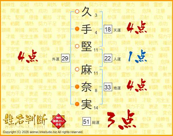 久(3画)手(4画)堅(11画) 麻(11画)奈(8画)実(14画)