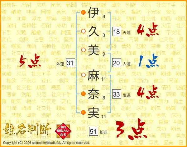 伊(6画)久(3画)美(9画) 麻(11画)奈(8画)実(14画)