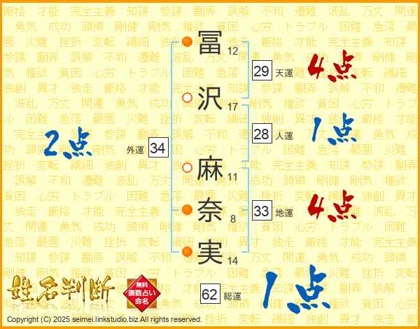 冨(12画)沢(17画) 麻(11画)奈(8画)実(14画)