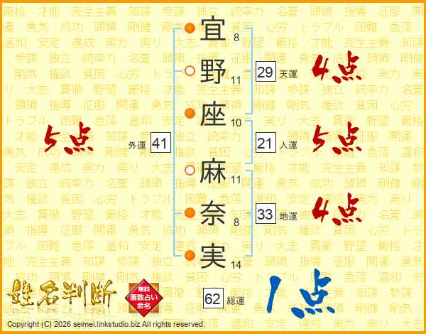 宜(8画)野(11画)座(10画) 麻(11画)奈(8画)実(14画)