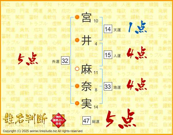 宮(10画)井(4画) 麻(11画)奈(8画)実(14画)