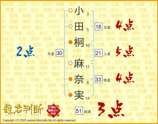 小(3画)田(5画)桐(10画) 麻(11画)奈(8画)実(14画)
