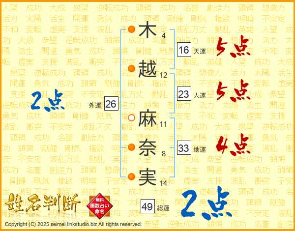 木(4画)越(12画) 麻(11画)奈(8画)実(14画)
