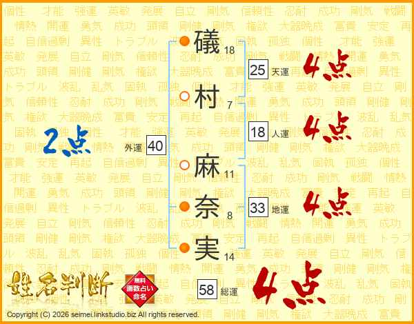 礒(18画)村(7画) 麻(11画)奈(8画)実(14画)