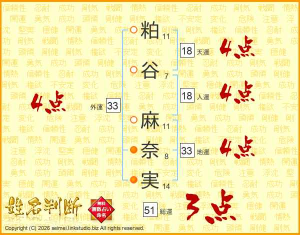 粕(11画)谷(7画) 麻(11画)奈(8画)実(14画)