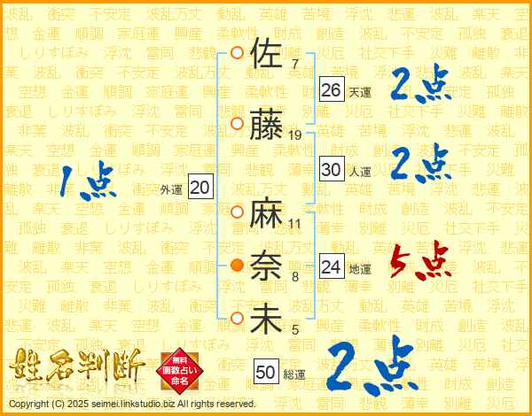 佐(7画)藤(19画) 麻(11画)奈(8画)未(5画)