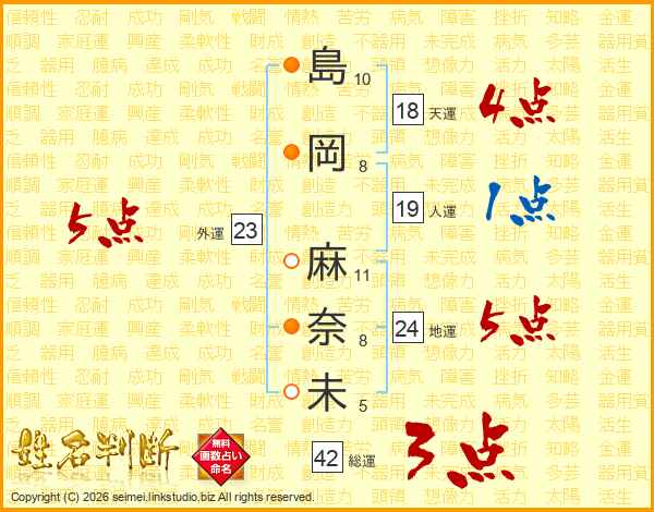 島(10画)岡(8画) 麻(11画)奈(8画)未(5画)
