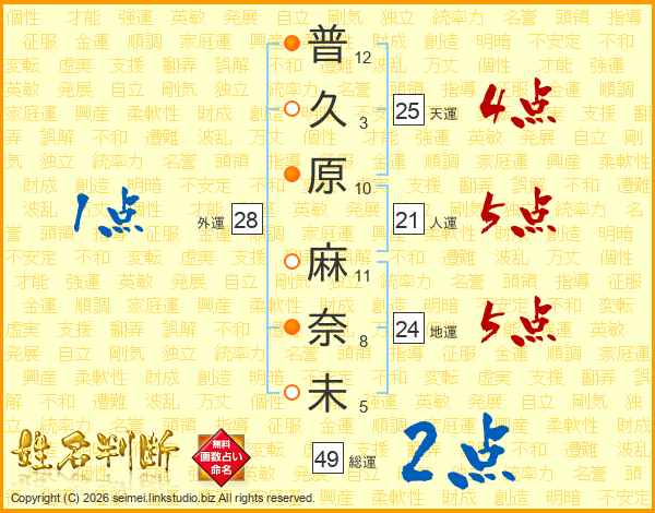 普(12画)久(3画)原(10画) 麻(11画)奈(8画)未(5画)