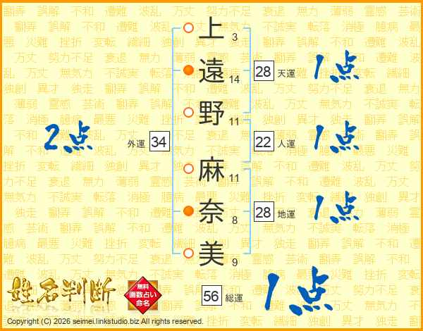 上(3画)遠(14画)野(11画) 麻(11画)奈(8画)美(9画)