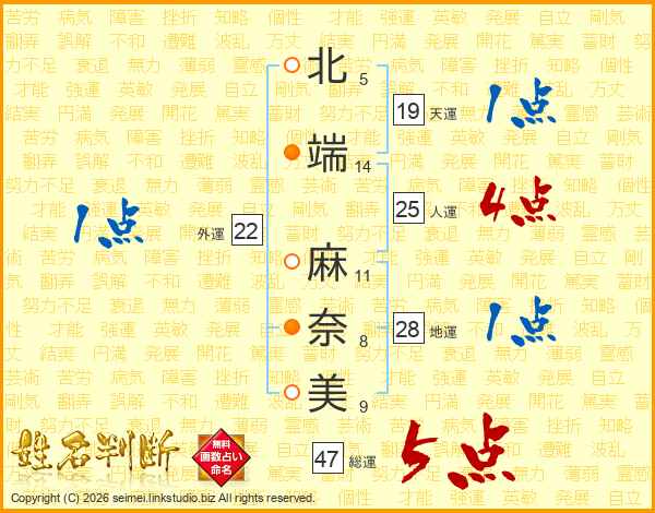 北(5画)端(14画) 麻(11画)奈(8画)美(9画)