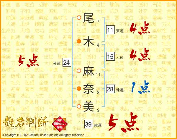 尾(7画)木(4画) 麻(11画)奈(8画)美(9画)