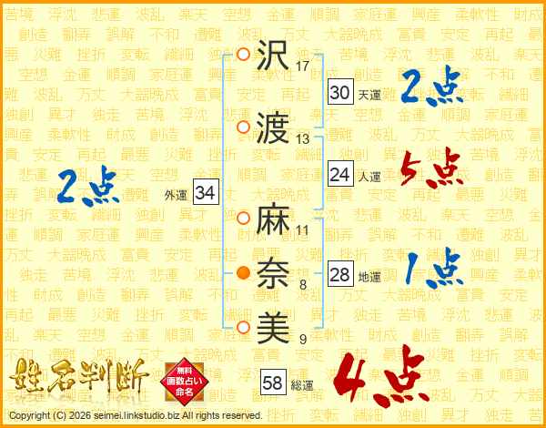 沢(17画)渡(13画) 麻(11画)奈(8画)美(9画)