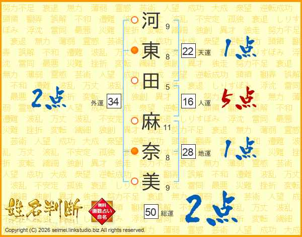 河(9画)東(8画)田(5画)  麻(11画)奈(8画)美(9画)