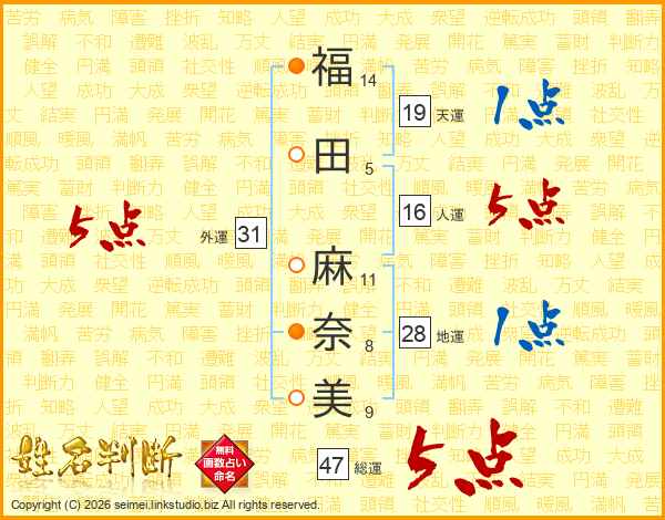 福(14画)田(5画) 麻(11画)奈(8画)美(9画)