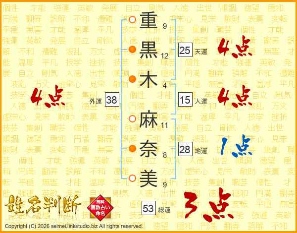 重(9画)黒(12画)木(4画) 麻(11画)奈(8画)美(9画)
