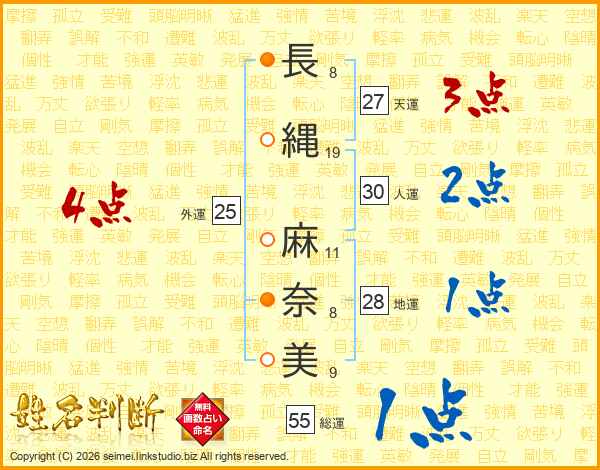 長(8画)縄(19画) 麻(11画)奈(8画)美(9画)