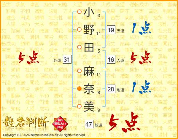 小(3画)野(11画)田(5画) 麻(11画)奈(8画)美(9画)