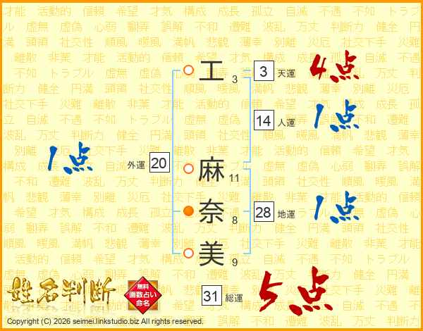 生活面を象徴する運勢です。外部から受ける影響力を表し、結婚運、家庭運や職場、環境への順応性を表します。総運から人運を引いた画数。姓や名が1文字の場合を除く。